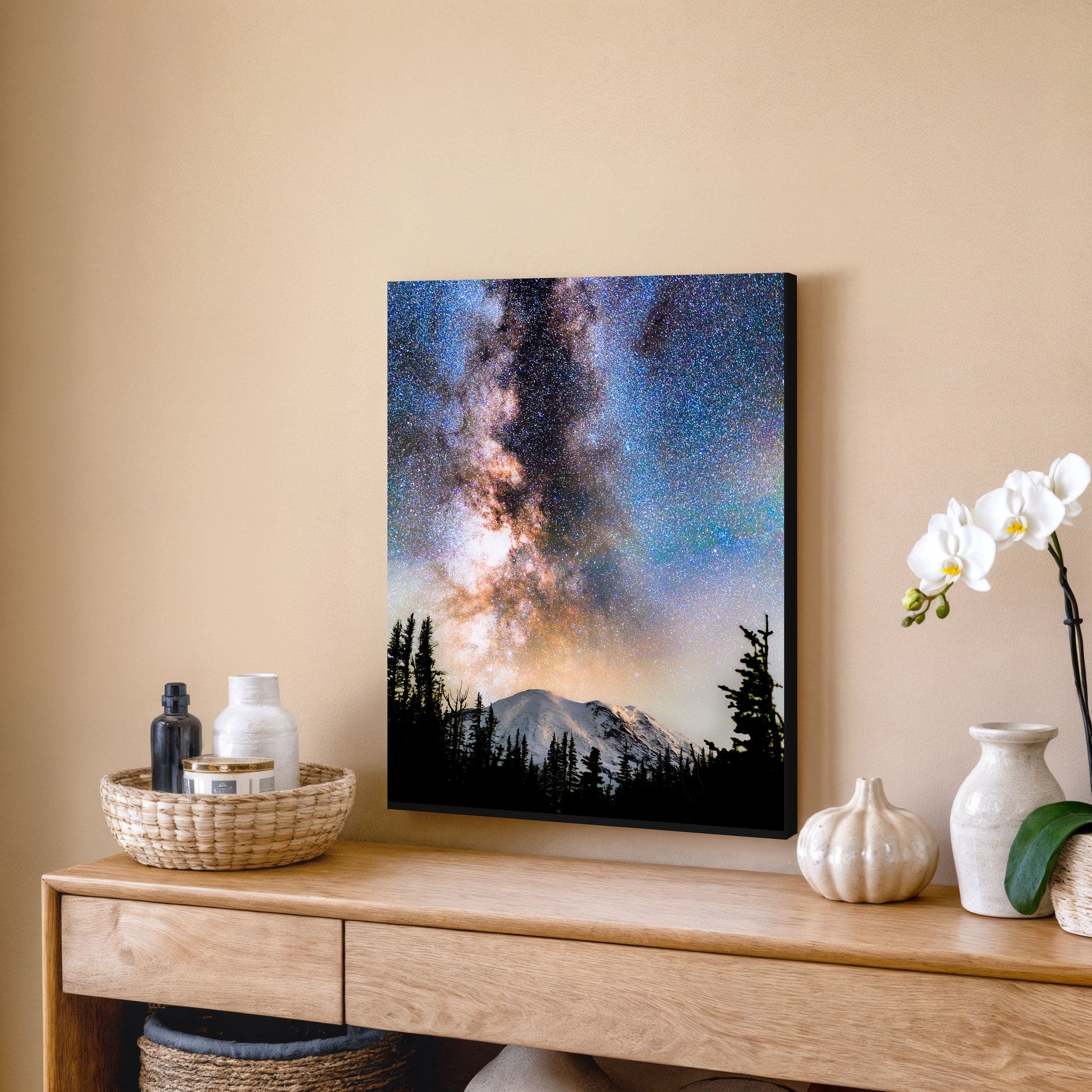 Transform your space with Volcano—a striking portrayal of Mount Rainier illuminated by the Milky Way’s radiant ascent.
